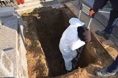 Pierwszą z nich zrealizowano pod nadzorem prokuratora, w ramach postępowania prowadzonego przez OKŚZpNP w Lublinie. W ciągu trzech dni przebadano dwa groby. W pierwszym z nich, po podjęciu szczątków osób pochowanych powyżej, na głębokości 2 m 35 cm ujawniono luźne szczątki ludzkie, w tym kość ramienną i kilka żeber. Z karty grobu wynikało, że pierwotnie była to mogiła więzienna. W 1990 r. dokonano tam pierwszego, wtórnego pochówku. Należy przypuszczać, że podczas pogłębiania grobu natrafiono na szczątki więźniów i przeniesiono je w inne, nieznane miejsce. Czynności te wykonano jednak niedbale, o czym świadczyły pozostawione na dnie jamy grobowej luźne kości.