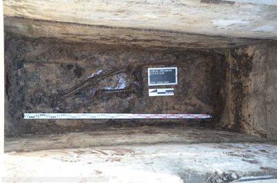 W kolejnej mogile, pod warstwą późniejszych pochówków, ujawniono niekompletny szkielet w układzie anatomicznym, który był ułożony przednimi powierzchniami ciała ku dołowi. Zachowały się m.in. kości obręczy biodrowej, kończyn dolnych oraz przedramienia prawego. Ponadto ujawniono powtarzającą się lewą kość biodrową oraz prawą i lewą kość strzałkową, co wskazuje, że podjęte szczątki należały do co najmniej dwóch osób. Przypuszczalnie szkielety zostały częściowo podjęte podczas pogłębiania grobu pod wtórny pochówek, a następnie przeniesione w inne, nieoznaczone miejsce na cmentarzu.