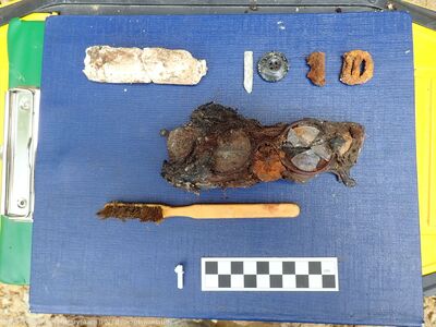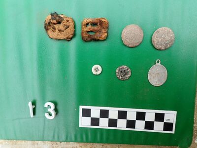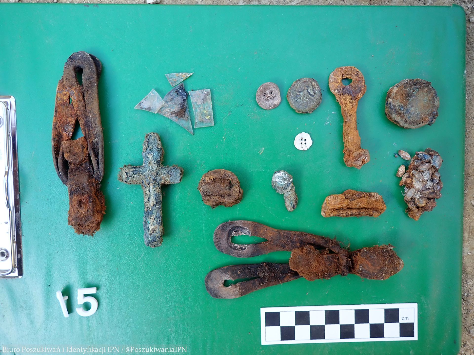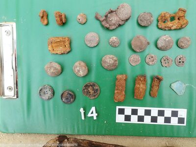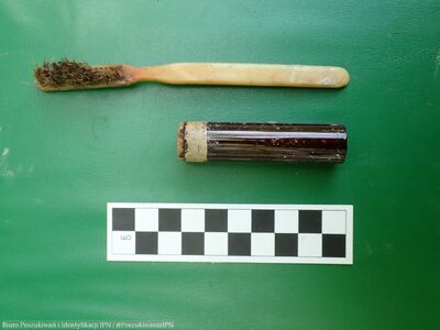 Przy szczątkach ujawniono przedmioty osobiste, jak: medalik z wizerunkiem Matki Boskiej, krzyżyk, różaniec, szczoteczki do zębów, klucz czy okulary. Przy kilku szkieletach odnaleziono guziki mundurowe z orzełkiem oraz guziki strażackie.