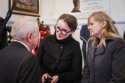 Naczelnik Sylwia Kurzyp wręczyła panu Kazimierzowi obrączkę należącą do jego ojca, która została znaleziona podczas prac ekhumacyjnych w Łęgu.
